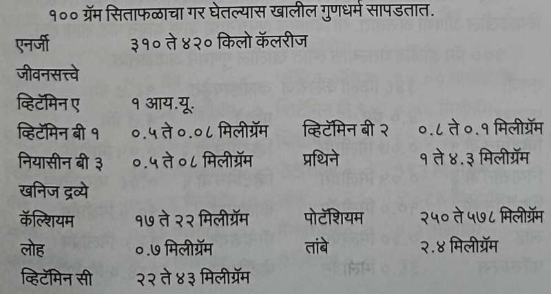 सिताफळ हे अत्यंत पौष्टिक फळ आहे. यात प्रथिने, खनिज द्रव्ये, जीवनसत्त्वे, फायबर, व्हिटॅमिन ए आणि सी भरपूर प्रमाणात सापडते. तसेच अमायनो ॲसिड भरपूर प्रमाणात असते. सिताफळाच्या पानात काही प्रमाणात औषधी, बियापासून तेल काढून त्याचा उपयोग साबण निर्मितीसाठी करतात. सिताफळात एवढी जीवनशक्ती असते की ते एक पूरक अन्नही मिळू शकते. सिताफळामध्ये व्हिटॅमिन ए तसेच सी तसेच फायबरही असू शकतात. त्याचप्रमाणे खनिज द्रव्ये म्हणजे पोटॅशियम अथवा मॅग्नेशियम तसेच भरपूर प्रमाणात प्रथिने म्हणजेच अमायनो ॲसिड सापडतात.