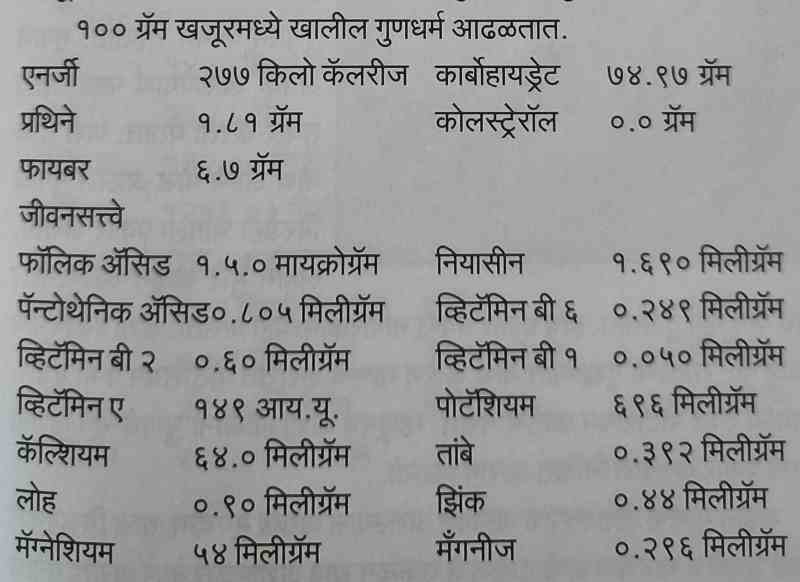 १०० ग्रॅम खजूरमध्ये खालील गुणधर्म आढळतात.