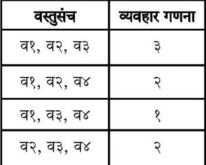 यातील वस्तुसंच {व१, व२, व४}, {व१, व३, व४} आणि { व२, व३, व४} या वस्तुसंचांची व्यवहार गणना ठरवलेल्या कमीतकमी आधारापेक्षाही कमी असल्याने, त्यांनाही पुढील गणनेतून काढून टाकण्यात येतं.