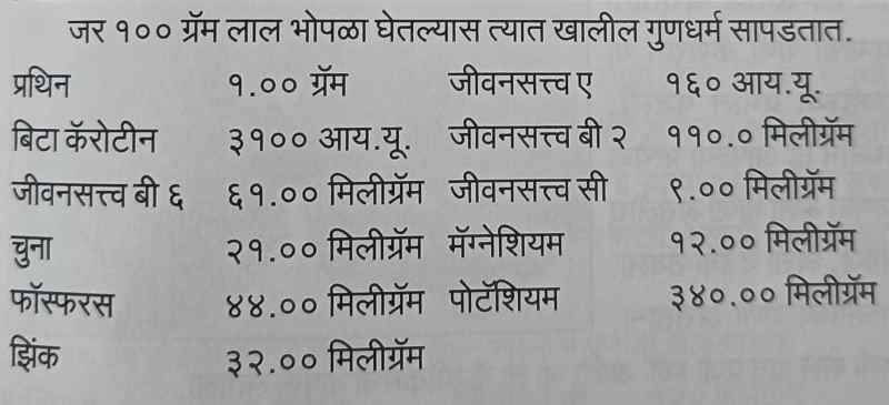 जर १०० ग्रॅम लाल भोपळा घेतल्यास त्यात खालील गुणधर्म सापडतात.