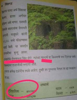 ‘तानाजीचे टोपण नांव सिंह होते. त्याच्या मानार्थ किल्ल्याचे नांव सिंहगड पडले’ ही वाक्य रचना नेमकी कुठली? मानार्थ की स्मरणार्थ? पडले की दिले की मिळाले? पुढे खाली मराठी शब्दांचे इंग्रजीत अर्थ दिले आहेत. त्यात ‘ऐतिहासिक’चा इंग्रजी अर्थ ‘Ancient’ असा दिला आहे. ‘ऐतिहासिक’ या शब्दाचा इंग्रजी अर्थ Historical असा असला पाहीजे, तो थेट ‘प्राचिन’ असा का आणि कोणी केला? यावरून एकच गोष्ट सिद्ध होते, की आपल्या मुलांना धड त्यांची मातृभाषाही येत नाही आणि इंग्रजी तर त्याहूनही येत नसावी. भाषेसारख्या संपर्काच्या अगदी प्राथमिक गोष्टीची ही अवस्था असेल तर काय तो देश प्रगती करणार?