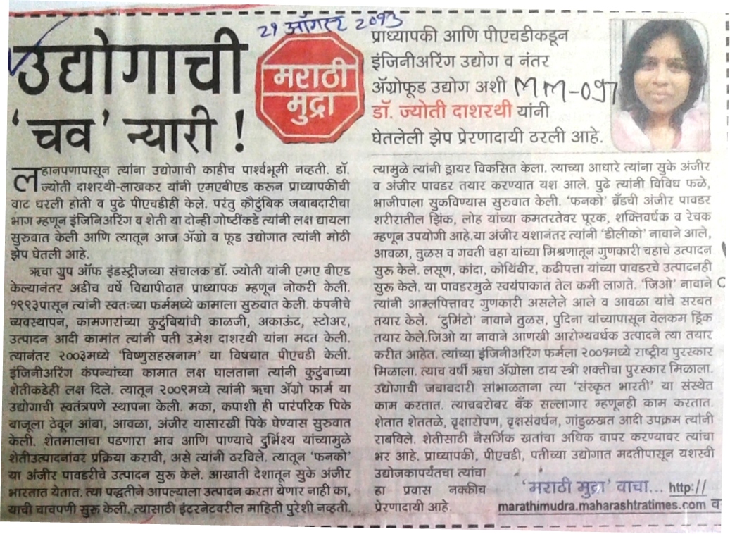 डॉ. ज्योती दशरथी यांच्याविषयी महाराष्ट्र टाईम्सच्या म.टा. नोंद या सदरात प्रकाशित झालेला उद्योगाची ‘चव’ न्यारी ! हा लेख वाचा.