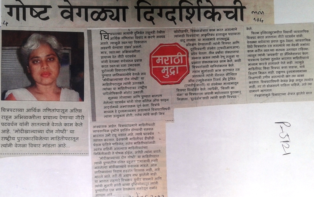 गौरी पटवर्धन यांच्याविषयी महाराष्ट्र टाईम्सच्या म.टा. नोंद या सदरात प्रकाशित झालेला गोष्ट वेगळ्या दिग्दर्शिकेची हा लेख वाचा.